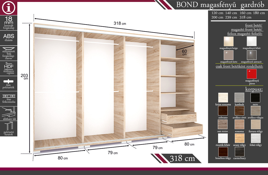 • Korpusz színek: zebrano, creme sonoma tölgy, san remo tölgy, nero, ferrara tölgy, rusztik fehér,  avelinó sötét, canterbury, katthult szürke, arany tölgy, fehér tölgy és bourbon tölgy