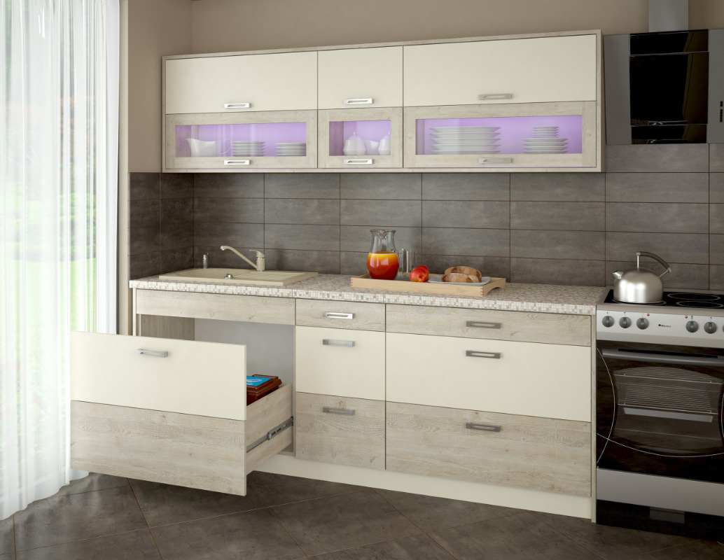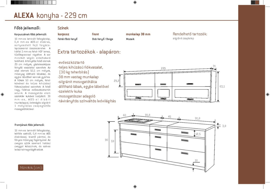 18 mm-es laminált faforgácslap, 0,4 mm-es ABS-el élzárva, süllyesztett fejű forgácslapcsavarral összeszerelve. A hátfal 3 mm-es fehér HDF lemez, tűzőkapoccsal rögzítve. A sor mindkét végén oldaltakaró található. A felnyílós felső elemek 29 cm mélyek, gázteleszkópos felnyíló vasalattal szereltek. Az alsó elemek fehér színű korpusszal, 50,5 cm mélységgel, műanyag állítható lábakkal, és egybe lábelővel gyártottak. A fiókok 45 cm mélyek, fehér kávával és teljes kihúzású fiókcsúszóval szereltek. A felső nagy fiókhoz evőeszköztartót adunk. A mosogatós elem szelektív kukával beépített. 38 mm-es, ABS-el élzárt darabolt, elemenként rászerelt munkalappal, beépíthető silgránit 1 mélytálas csepegtetős mosogatótálcával.