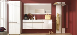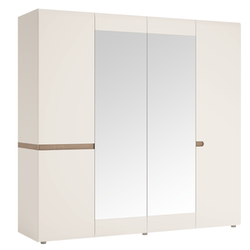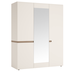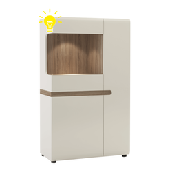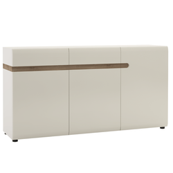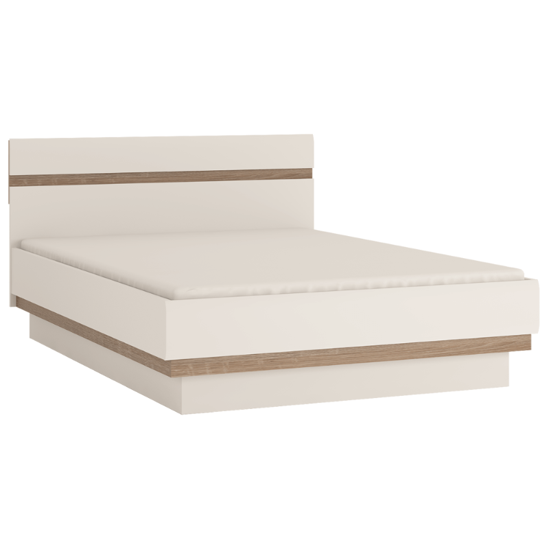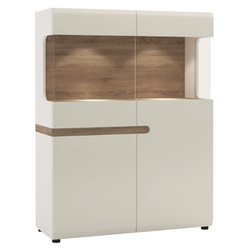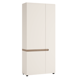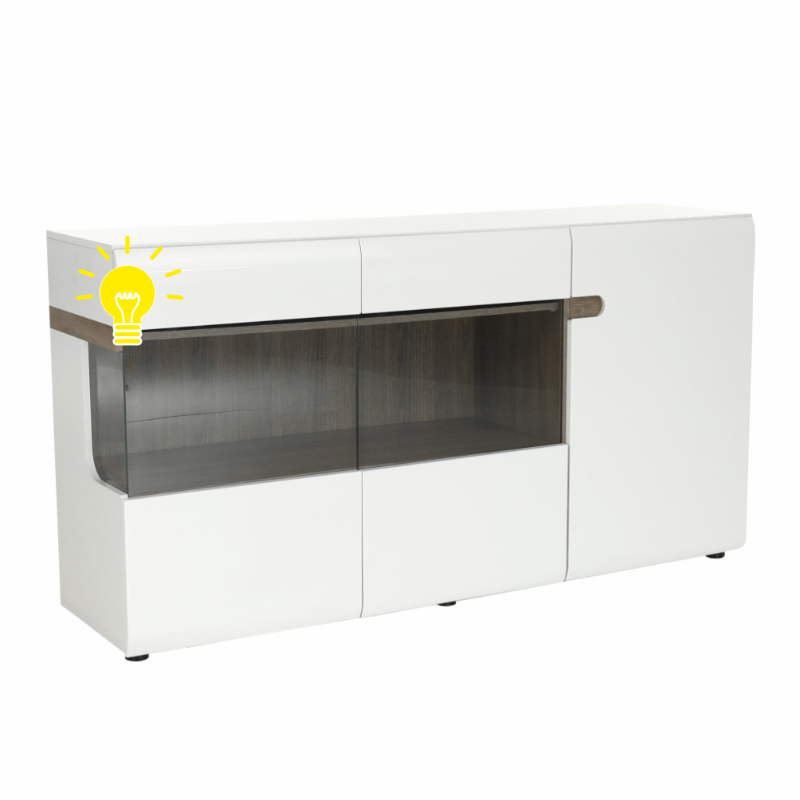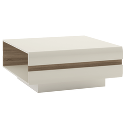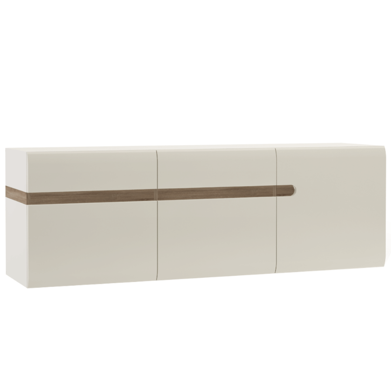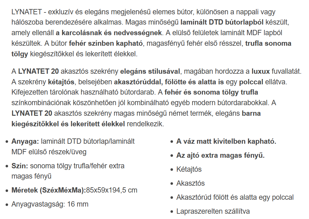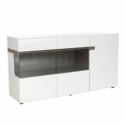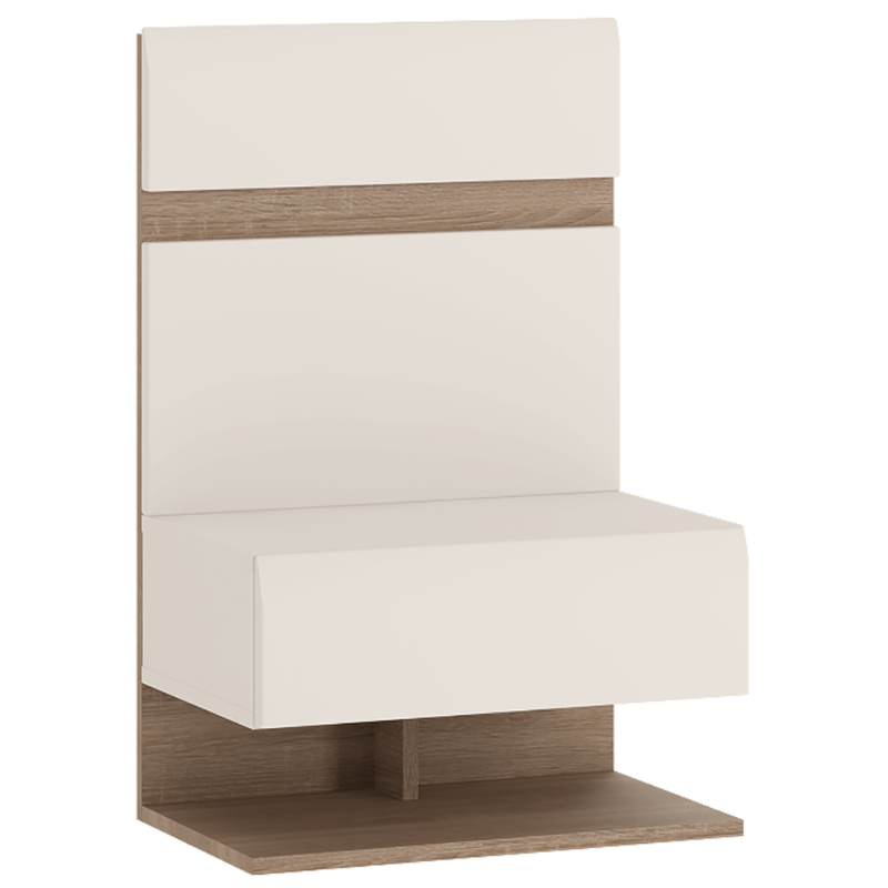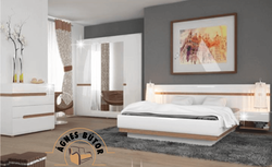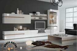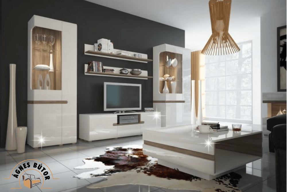 Fehér és Truffla Sonoma tölgy színű, extramagasfényű, elemes nappali és hálószoba bútor.