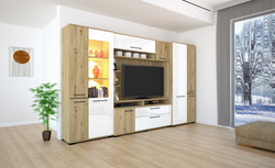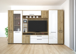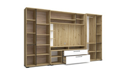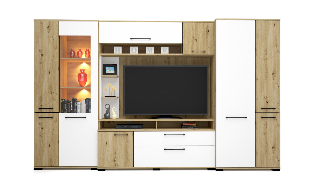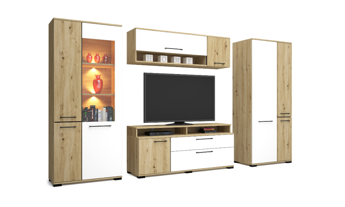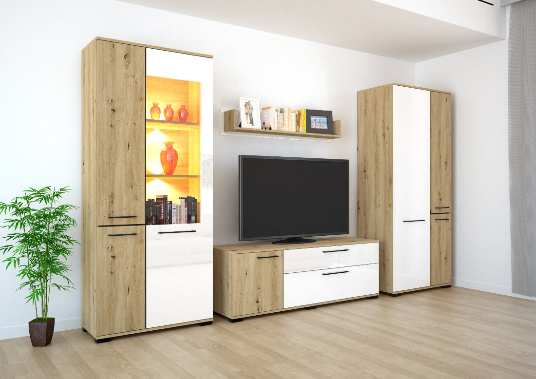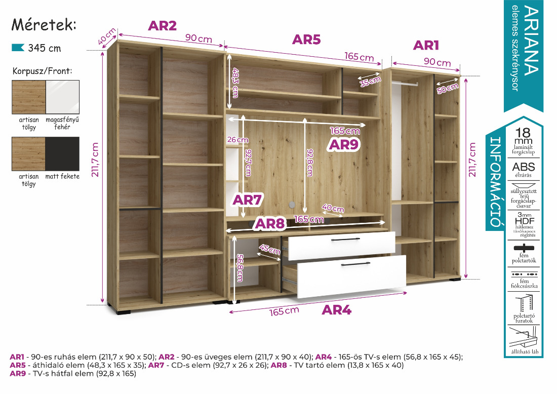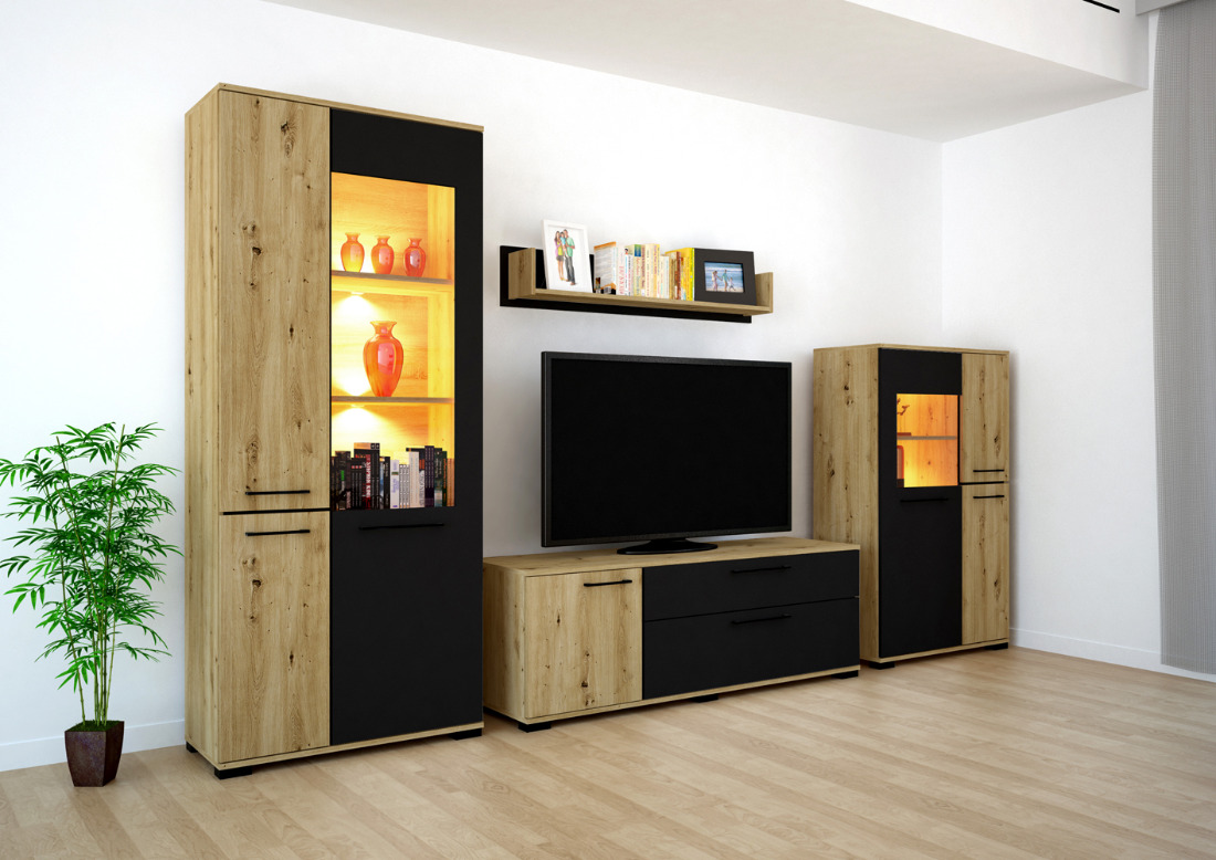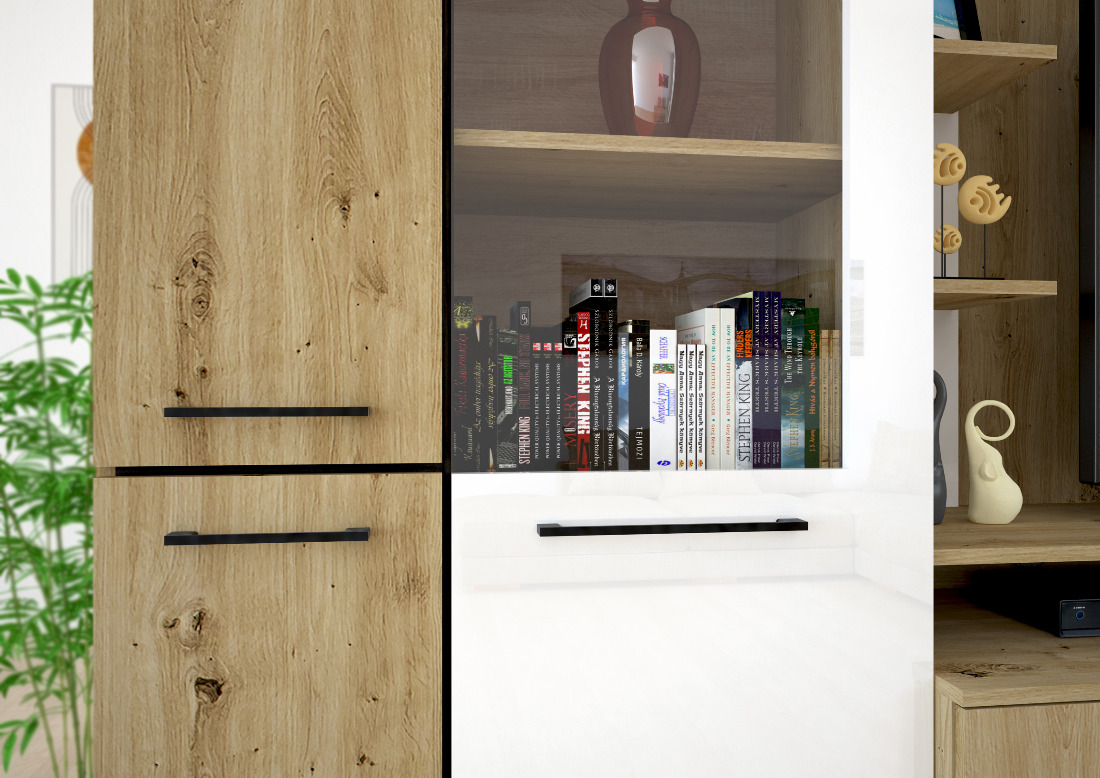 Az Ariana szekrénysor artisan tölgy – magasfényű fehér vagy artisan tölgy – matt fekete színkombinációban kapható. Tetszés szerint akár további elemekkel is kiegészíthető, vagy Ariana elemeket rendelve saját igényeink szerint állítható össze szekrénysorunk. Az üveges elemekbe opcionálisan LED világítás is kérhető.